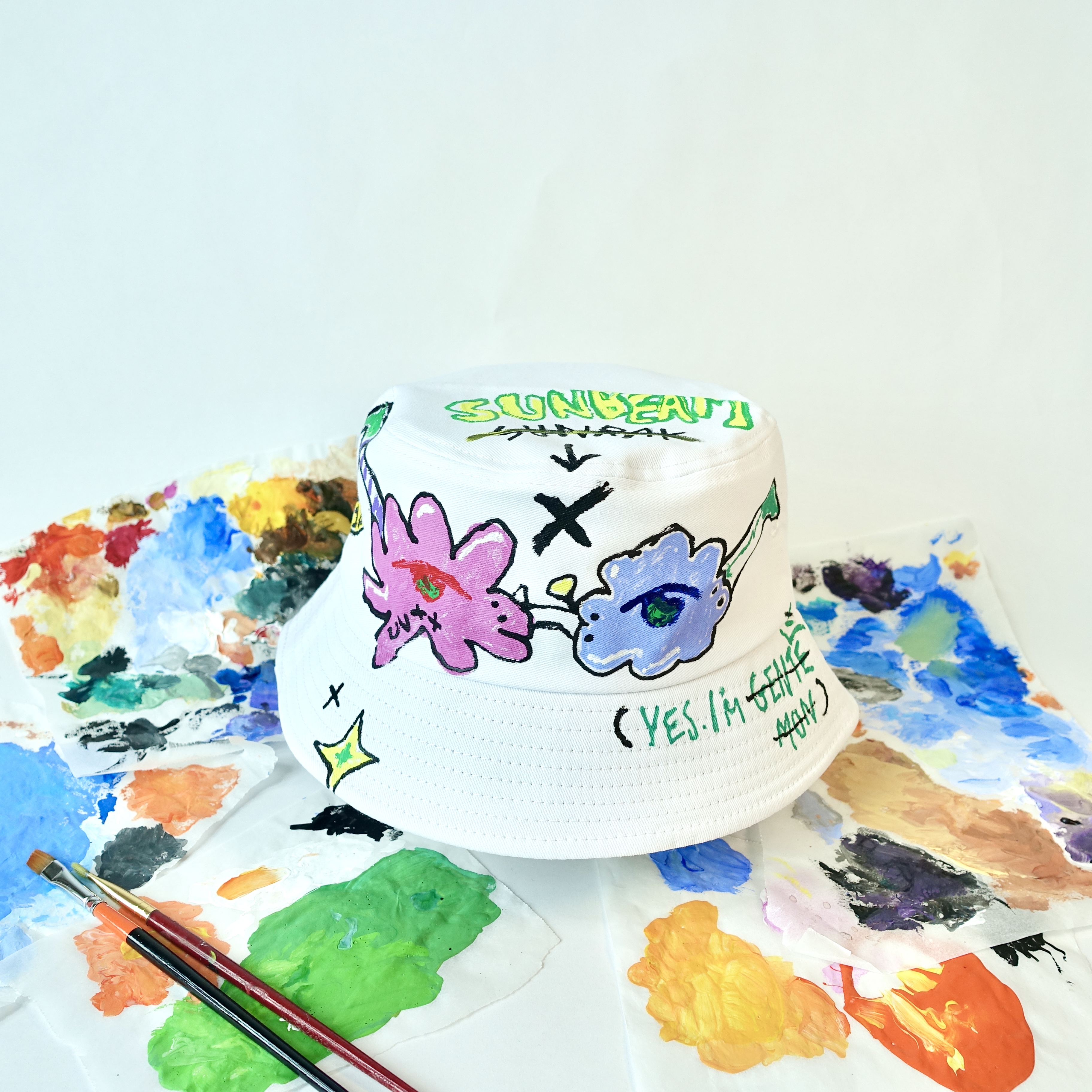 면 버킷햇에 직물용 물감을 이용하여 손으로 그린 작품입니다. 여름에 어울리는 색감을 이용한 작업물로 스트릿 캐주얼 패션에 어울리는 모자입니다. ( One & Only 팔리면 끝! 하나 밖에 없는 작품입니다.)
